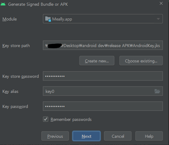 APK를 재추출할때 자동적으로 Key 스토어 정보들이 등록되있으실 겁니다. 그