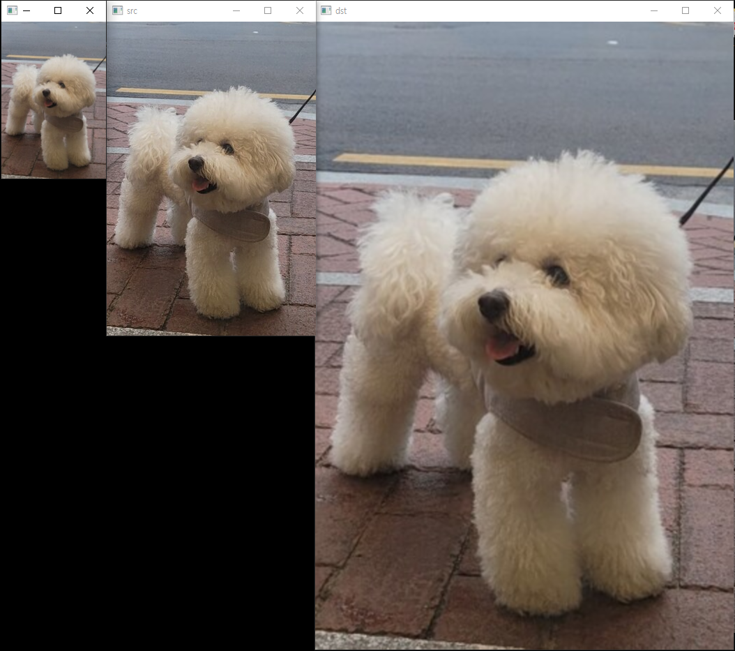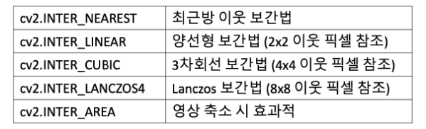 - interpolation: 보간법 지정, 기본값은 cv2.INTER_LINEAR