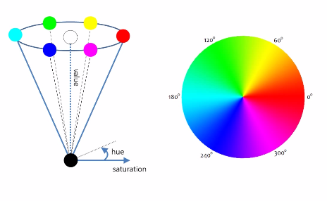 색상 : H 0 ~ 360의 범위를 가지고 , 가장 파장이 긴 빨간색을 0도로 지정