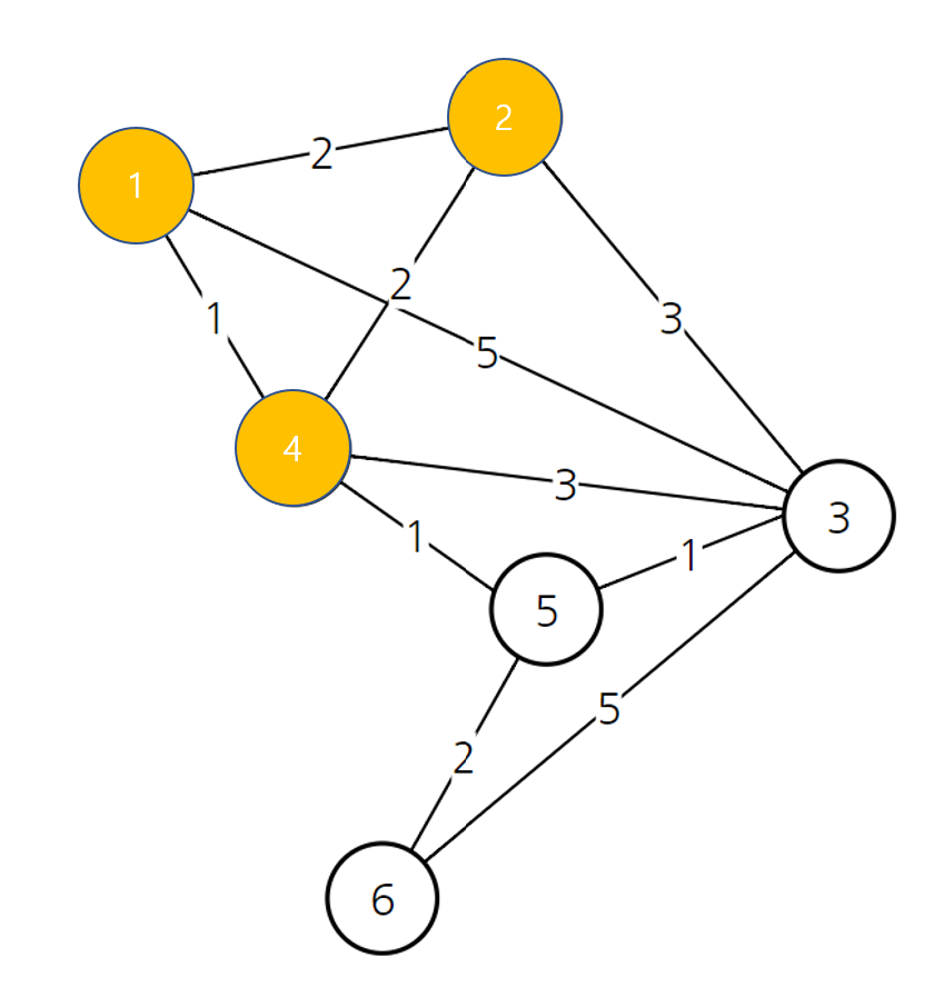 - 방문하지 않은 노드 중 연경 된 노드 : 6