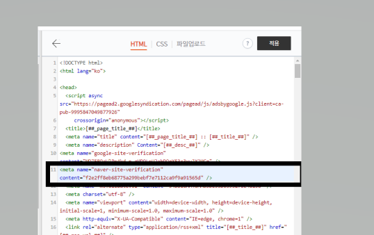 복사한 메타태그를 head 부분에 붙여주기 ! > 적용 버튼 클릭 !